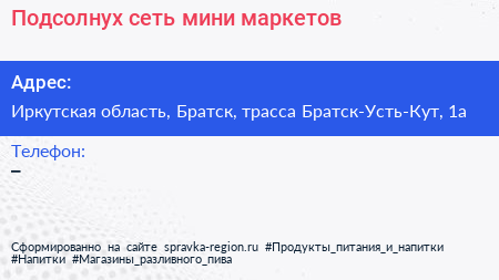 Подсолнух, сеть мини-маркетов по адресу Иркутская область, Братск, трасса Братск-Усть-Кут, 1а в дальнейшем Организация, размещена в следующих категориях:
