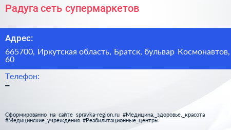 Радуга, сеть супермаркетов по адресу 665700, Иркутская область, Братск, бульвар Космонавтов, 60 в дальнейшем Организация, размещена в следующих категориях: