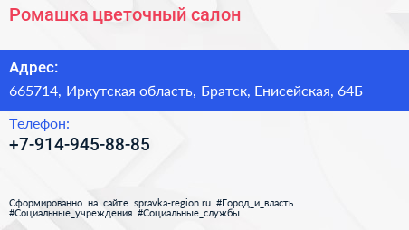 Ромашка, цветочный салон по адресу 665714, Иркутская область, Братск, Енисейская, 64Б в дальнейшем Организация, размещена в следующих категориях: