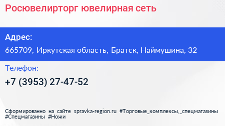 Росювелирторг, ювелирная сеть по адресу 665709, Иркутская область, Братск, Наймушина, 32 в дальнейшем Организация, размещена в следующих категориях: