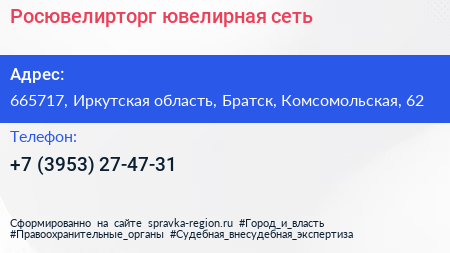 Росювелирторг, ювелирная сеть по адресу 665717, Иркутская область, Братск, Комсомольская, 62 в дальнейшем Организация, размещена в следующих категориях: