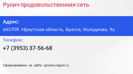 Русич, продовольственная сеть по адресу 665709, Иркутская область, Братск, Холоднова, 9а в дальнейшем Организация, размещена в следующих категориях: