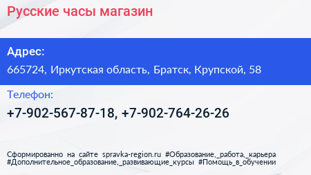 Русские часы, магазин по адресу 665724, Иркутская область, Братск, Крупской, 58 в дальнейшем Организация, размещена в следующих категориях: