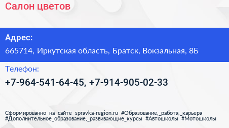 Салон цветов по адресу 665714, Иркутская область, Братск, Вокзальная, 8Б в дальнейшем Организация, размещена в следующих категориях: