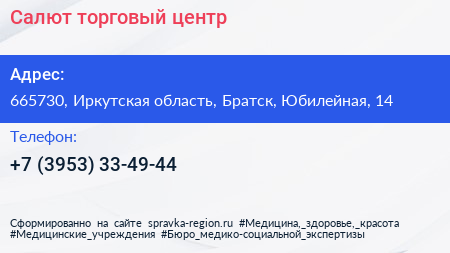 Салют, торговый центр по адресу 665730, Иркутская область, Братск, Юбилейная, 14 в дальнейшем Организация, размещена в следующих категориях: