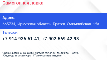 Самогонная лавка по адресу 665734, Иркутская область, Братск, Олимпийская, 15а в дальнейшем Организация, размещена в следующих категориях: