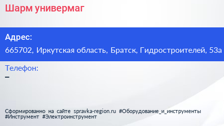 Шарм, универмаг по адресу 665702, Иркутская область, Братск, Гидростроителей, 53а в дальнейшем Организация, размещена в следующих категориях: