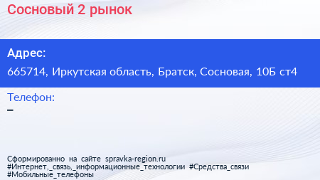 Сосновый-2, рынок по адресу 665714, Иркутская область, Братск, Сосновая, 10Б ст4 в дальнейшем Организация, размещена в следующих категориях: