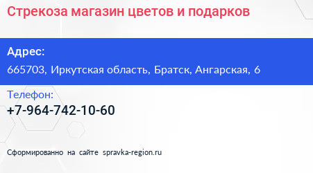 Стрекоза, магазин цветов и подарков по адресу 665703, Иркутская область, Братск, Ангарская, 6 в дальнейшем Организация, размещена в следующих категориях: