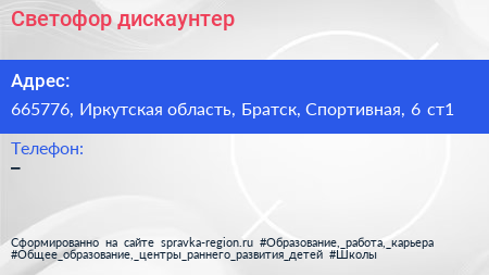 Светофор, дискаунтер по адресу 665776, Иркутская область, Братск, Спортивная, 6 ст1 в дальнейшем Организация, размещена в следующих категориях: