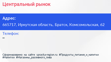 Центральный рынок по адресу 665717, Иркутская область, Братск, Комсомольская, 62 в дальнейшем Организация, размещена в следующих категориях: