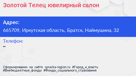 Золотой Телец, ювелирный салон по адресу 665709, Иркутская область, Братск, Наймушина, 32 в дальнейшем Организация, размещена в следующих категориях:
