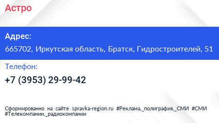 Астро по адресу 665702, Иркутская область, Братск, Гидростроителей, 51 в дальнейшем Организация, размещена в следующих категориях: