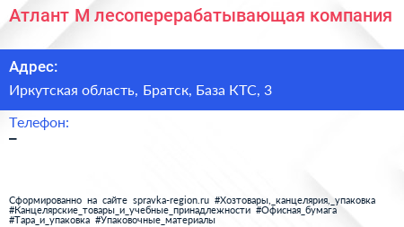 Атлант-М, лесоперерабатывающая компания по адресу Иркутская область, Братск, База КТС, 3 в дальнейшем Организация, размещена в следующих категориях: