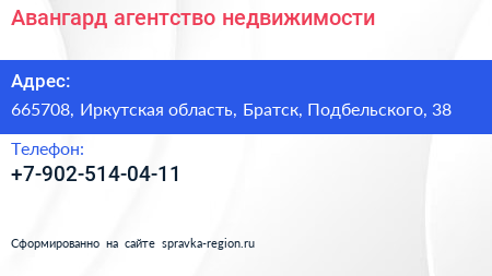 Авангард, агентство недвижимости по адресу 665708, Иркутская область, Братск, Подбельского, 38 в дальнейшем Организация, размещена в следующих категориях: