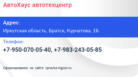 АвтоХаус, автотехцентр по адресу Иркутская область, Братск, Курчатова, 1Б в дальнейшем Организация, размещена в следующих категориях: