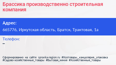Брассика, производственно-строительная компания по адресу 665776, Иркутская область, Братск, Трактовая, 1а в дальнейшем Организация, размещена в следующих категориях:
