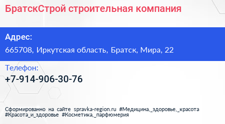 БратскСтрой, строительная компания по адресу 665708, Иркутская область, Братск, Мира, 22 в дальнейшем Организация, размещена в следующих категориях: