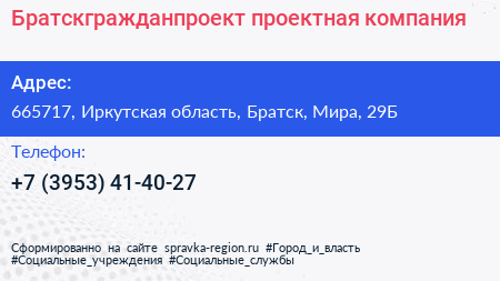 Братскгражданпроект, проектная компания по адресу 665717, Иркутская область, Братск, Мира, 29Б в дальнейшем Организация, размещена в следующих категориях: