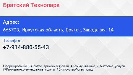 Братский Технопарк по адресу 665703, Иркутская область, Братск, Заводская, 14 в дальнейшем Организация, размещена в следующих категориях:
