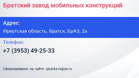 Братский завод мобильных конструкций по адресу Иркутская область, Братск, БрАЗ, 2а в дальнейшем Организация, размещена в следующих категориях: