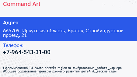 Command Art по адресу 665709, Иркутская область, Братск, Стройиндустрии проезд, 21 в дальнейшем Организация, размещена в следующих категориях: