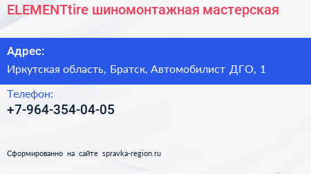 ELEMENTtire, шиномонтажная мастерская по адресу Иркутская область, Братск, Автомобилист ДГО, 1 в дальнейшем Организация, размещена в следующих категориях: