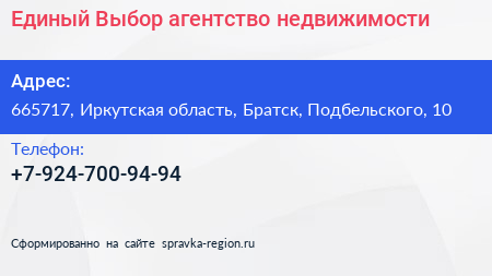 Единый Выбор, агентство недвижимости по адресу 665717, Иркутская область, Братск, Подбельского, 10 в дальнейшем Организация, размещена в следующих категориях:
