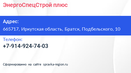 ЭнергоСпецСтрой плюс по адресу 665717, Иркутская область, Братск, Подбельского, 10 в дальнейшем Организация, размещена в следующих категориях: