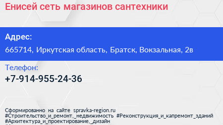 Енисей, сеть магазинов сантехники по адресу 665714, Иркутская область, Братск, Вокзальная, 2в в дальнейшем Организация, размещена в следующих категориях: