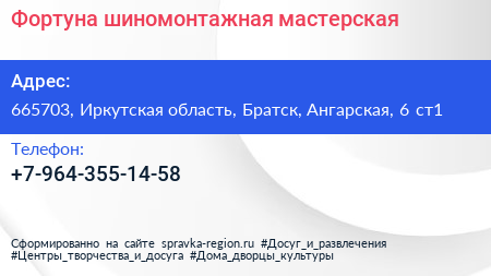 Фортуна, шиномонтажная мастерская по адресу 665703, Иркутская область, Братск, Ангарская, 6 ст1 в дальнейшем Организация, размещена в следующих категориях: