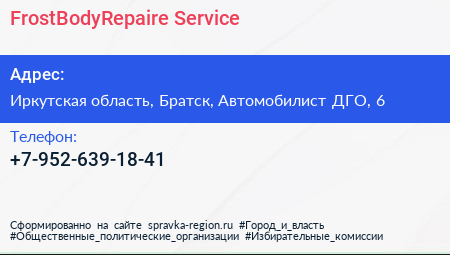 FrostBodyRepaire Service по адресу Иркутская область, Братск, Автомобилист ДГО, 6 в дальнейшем Организация, размещена в следующих категориях: