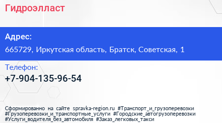 Гидроэлласт по адресу 665729, Иркутская область, Братск, Советская, 1 в дальнейшем Организация, размещена в следующих категориях: