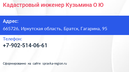 Кадастровый инженер Кузьмина О.Ю. по адресу 665726, Иркутская область, Братск, Гагарина, 95 в дальнейшем Организация, размещена в следующих категориях: