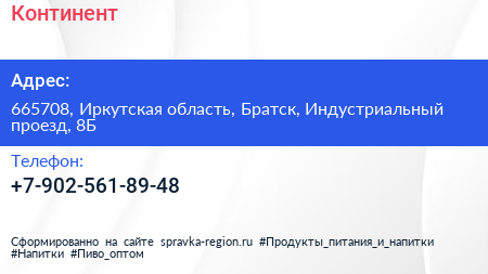 Континент по адресу 665708, Иркутская область, Братск, Индустриальный проезд, 8Б в дальнейшем Организация, размещена в следующих категориях: