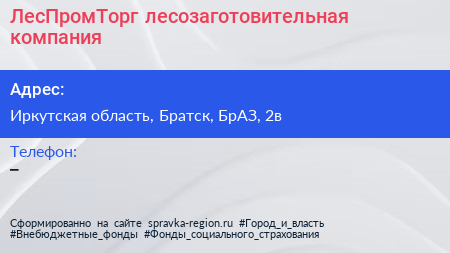 ЛесПромТорг, лесозаготовительная компания по адресу Иркутская область, Братск, БрАЗ, 2в в дальнейшем Организация, размещена в следующих категориях: