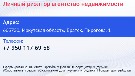 Личный риэлтор, агентство недвижимости по адресу 665730, Иркутская область, Братск, Пирогова, 1 в дальнейшем Организация, размещена в следующих категориях: