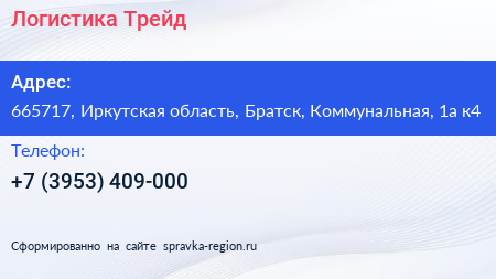 Логистика Трейд по адресу 665717, Иркутская область, Братск, Коммунальная, 1а к4 в дальнейшем Организация, размещена в следующих категориях: