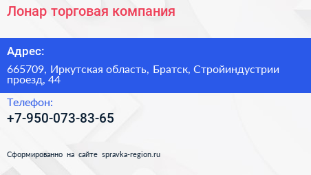 Лонар, торговая компания по адресу 665709, Иркутская область, Братск, Стройиндустрии проезд, 44 в дальнейшем Организация, размещена в следующих категориях: