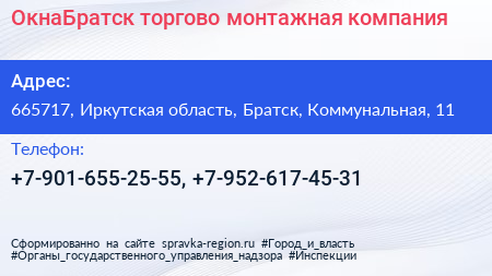 ОкнаБратск, торгово-монтажная компания по адресу 665717, Иркутская область, Братск, Коммунальная, 11 в дальнейшем Организация, размещена в следующих категориях:
