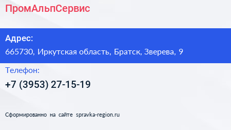 ПромАльпСервис по адресу 665730, Иркутская область, Братск, Зверева, 9 в дальнейшем Организация, размещена в следующих категориях: