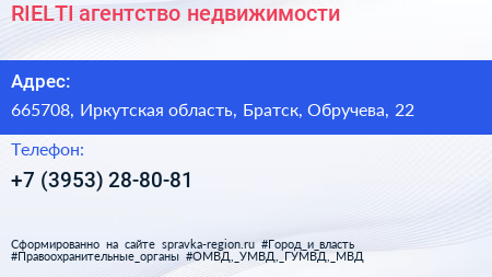 RIELTI, агентство недвижимости по адресу 665708, Иркутская область, Братск, Обручева, 22 в дальнейшем Организация, размещена в следующих категориях: