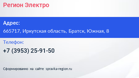 Регион-Электро по адресу 665717, Иркутская область, Братск, Южная, 8 в дальнейшем Организация, размещена в следующих категориях: