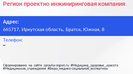 Регион, проектно-инжиниринговая компания по адресу 665717, Иркутская область, Братск, Южная, 8 в дальнейшем Организация, размещена в следующих категориях: