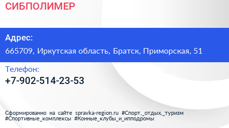 СИБПОЛИМЕР по адресу 665709, Иркутская область, Братск, Приморская, 51 в дальнейшем Организация, размещена в следующих категориях: