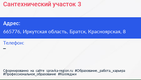 Сантехнический участок №3 по адресу 665776, Иркутская область, Братск, Красноярская, 8 в дальнейшем Организация, размещена в следующих категориях: