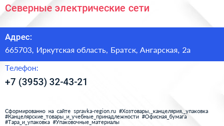 Северные электрические сети по адресу 665703, Иркутская область, Братск, Ангарская, 2а в дальнейшем Организация, размещена в следующих категориях: