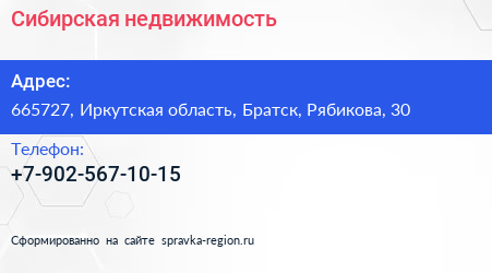 Сибирская недвижимость по адресу 665727, Иркутская область, Братск, Рябикова, 30 в дальнейшем Организация, размещена в следующих категориях: