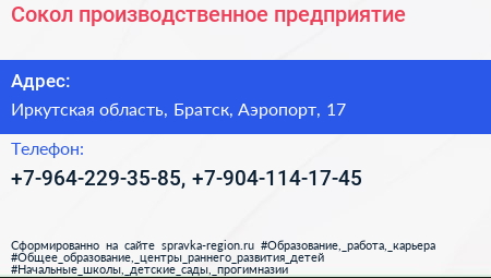 Сокол, производственное предприятие по адресу Иркутская область, Братск, Аэропорт, 17 в дальнейшем Организация, размещена в следующих категориях: