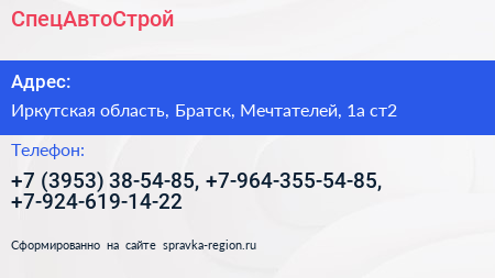 СпецАвтоСтрой по адресу Иркутская область, Братск, Мечтателей, 1а ст2 в дальнейшем Организация, размещена в следующих категориях: